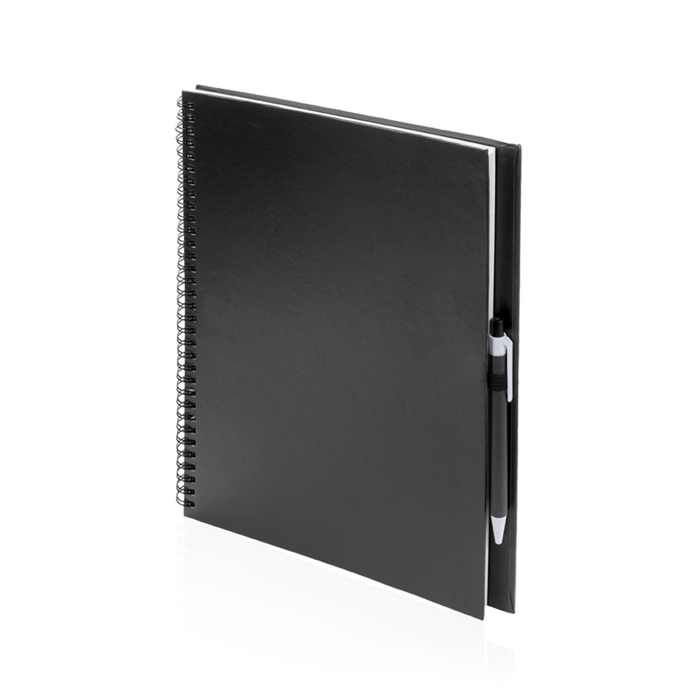 Ring notebook with soft-touch covers in resistant recycled cardboard and ball pen in matching color recycled cardboard. Bold colors, 80 blank sheets and ball pen holder on back cover.