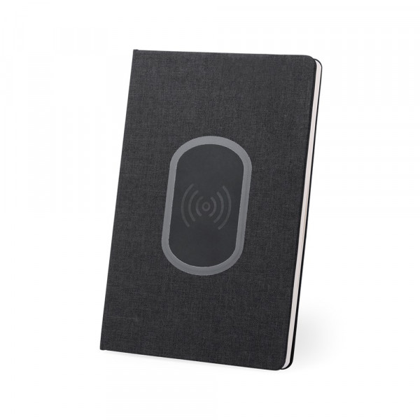 Notepad in resistant polyester 300D. Wireless charger integrated and sober design, with charging station on cover. Including 80 sheets with striped layout.