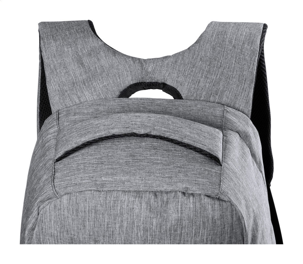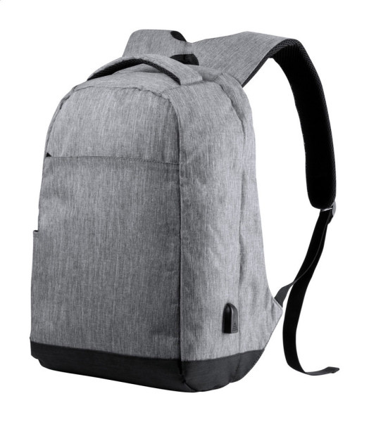 Anti-theft backpack with multiple pockets, padded laptop (15") and tablet (12") compartment, padded back and shoulder strap. With trolley strap and built-in USB connection for power banks. 300D Polyester.