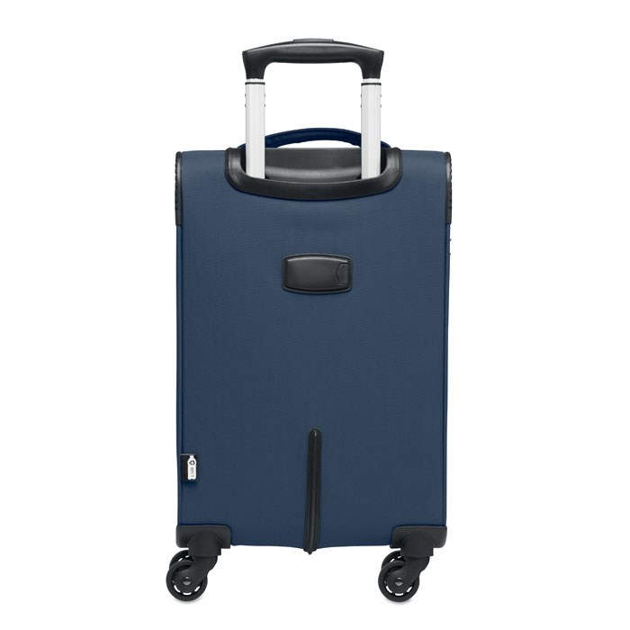 600D RPET Polyester soft side cabin trolley. Including exterior zipped laptop compartment. Zipped front pocket. Combi lock. Bottom compartment with ribbons.