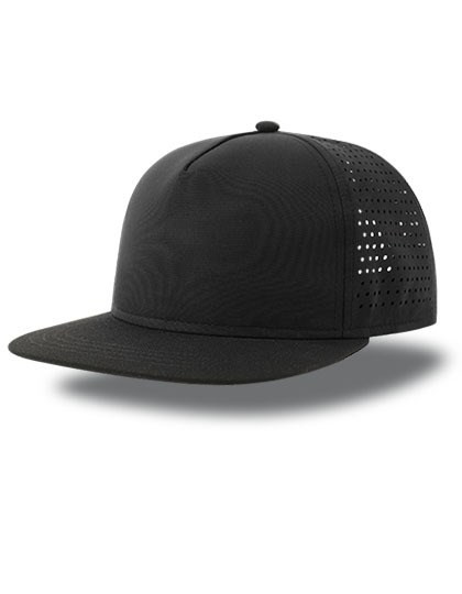 Structured streetwear hat made of recycled polyester microfiber and recycled polyester twill on bill | 5 panels shape and flat visor | Fine lasered holes on side and back