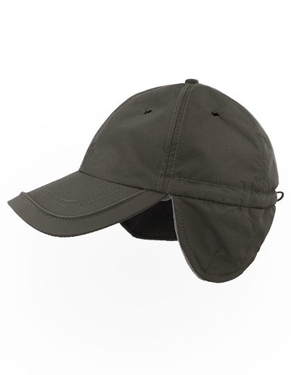 Outdoor winter hat with ear flaps made of recycled nylon | Water repellent outside and recycled polar fleece inside | Unstructured front panels and curved visor | Adjustable closure with elastic drawstrings and stopper
