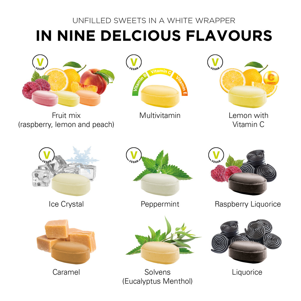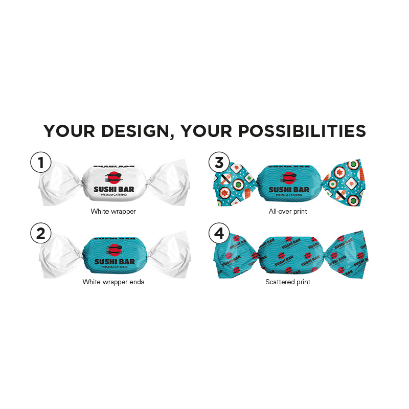 Sweet in a wrapper made of compostable white foil, unfilled, individually printed. Content: Ice Crystal sweets, candy, oval, single wrapped. Minimum quantity 50 kg (approx. 9,200 sweets), 5 g
