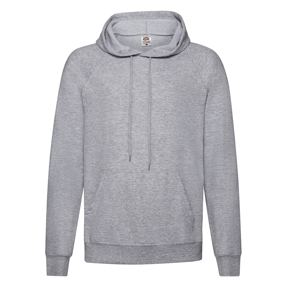 Adult sweatshirt Lightweight Hooded Sweat by Fruit Of The Loom. With hood and matching color, flat design adjusting cord. Made of lightweight unbrushed fleece in a combination of 80% cotton + 20% polyester 240g/m2. With ranglan sleeves and kangaroo pocket. Cotton/LYCRA® collar, waistband and cuffs. Available in a wide range of colours and in sizes S, M, L, XL, XXL.