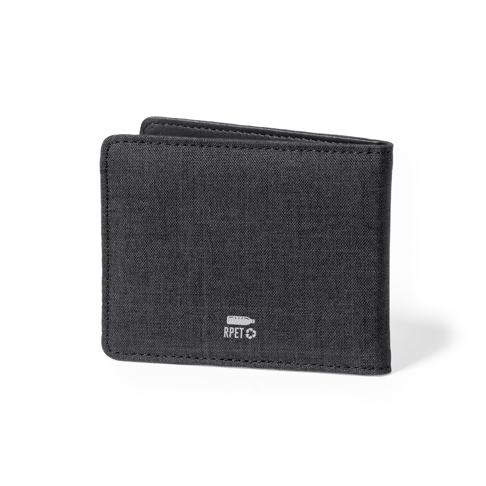 Elegant wallet and card holder made of RPET polyester with black finish. Inside with 6 independent compartments for cards and large wallet. RFID (Radio Frequency Identification) security technology that keeps card data safe. With the distinctive of RPET outside and the RIFD inside.RPET material is made from recycled plastic, to encourage the reuse of plastic waste and help the sustainability of the planet.