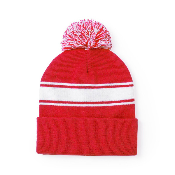 Soft and warm cap made in acrylic material, in a wide range of colors. Original design, with white front strip and bicolor pom pom in matching color.