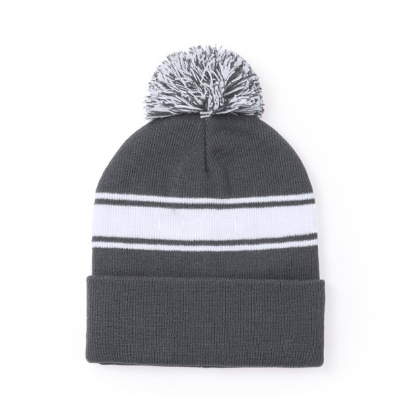 Soft and warm cap made in acrylic material, in a wide range of colors. Original design, with white front strip and bicolor pom pom in matching color.