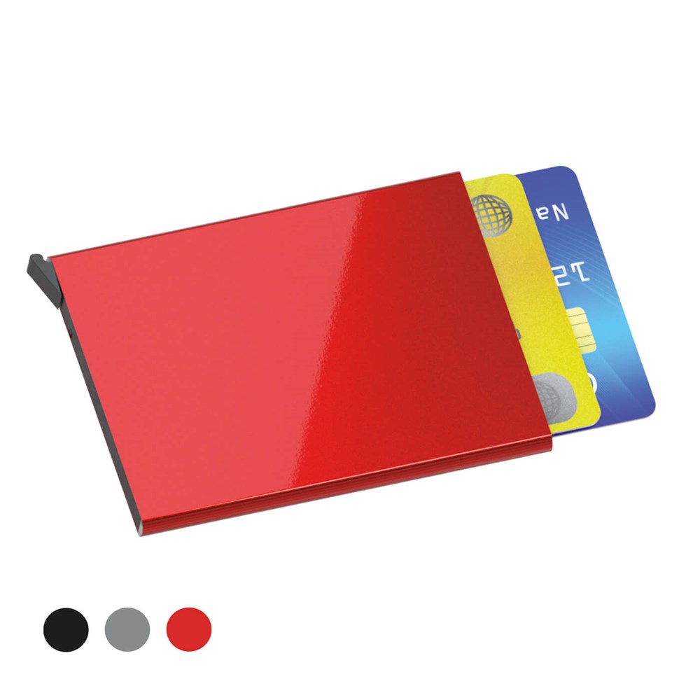 Cardholder with RFID lock that ensures electronic card data theft and completely isolates the cards from any magnetic sources. The satin-finish aluminium shell, available in black, silver and red, also protects cards from physical impacts and damage. The lever/latch mechanism quickly releases the cards from the holder, displaying them in a way which is easy to recognise and extract them. This light and compact cardholder is a suitable business gift, perfect for all budgets. It is customisable with the company logo on both sides thanks to laser incision, a technology which can design a logo which is almost indelible and ensure a long-lasting result.