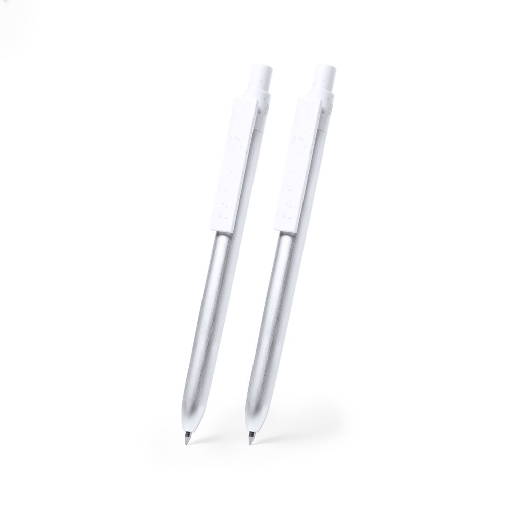 Eco-friendly set of ball pen and roller pen, made in recycled aluminium and with recycled ABS (RABS) details. Including: Ball pen in recycled aluminium with push-button mechanism, silver finish barrel and white fittings. With recycled aluminium logo on the top of the ball pen, jumbo cartridge and blue ink.Roller pen in recycled aluminium with push-button mechanism, silver finish barrel and white fittings. With recycled aluminium logo on the top of the ball pen, jumbo cartridge and blue ink.Set presented in an individual kraft design case with matching sleeve.Recycled aluminum has its origin in the almost infinite reuse of one of the materials with the greatest recyclability potential, keeping the quality of the resulting product. This feature turns it into an eco-friendly material of recycled origin, easily recyclable. Besides, new material and resources can be obtained from treatment and waste processes, consuming less energy among others sustainable factors.GRS Certification (Global Recycled Standard), which guarantees the recycled origin of the material used to manufacture the product.