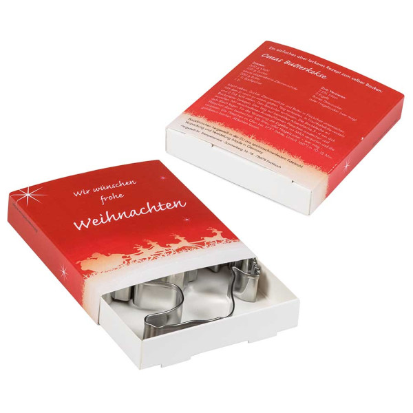 Keep calm, eat a cookie! Why give away baking shapes only for Christmas? The high-quality baking utensils made of stainless steel (dishwasher-safe) in many shapes are perfect for baked goods at summer garden parties or small barbecue licks. The set is delivered in a fully printable cardboard box.