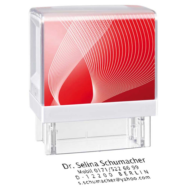 Individual made, constant rubber stamp, made of natural rubber. Integrated, exchangeable stamp pad. Individual Promotion on the promotional inlay. Further sizes on request.