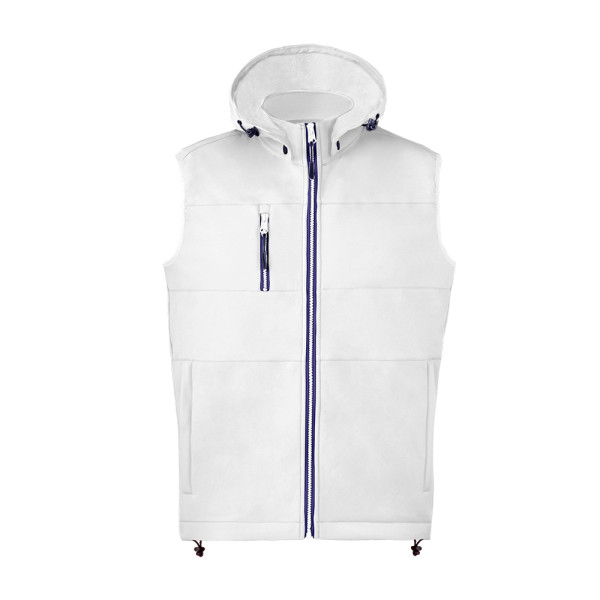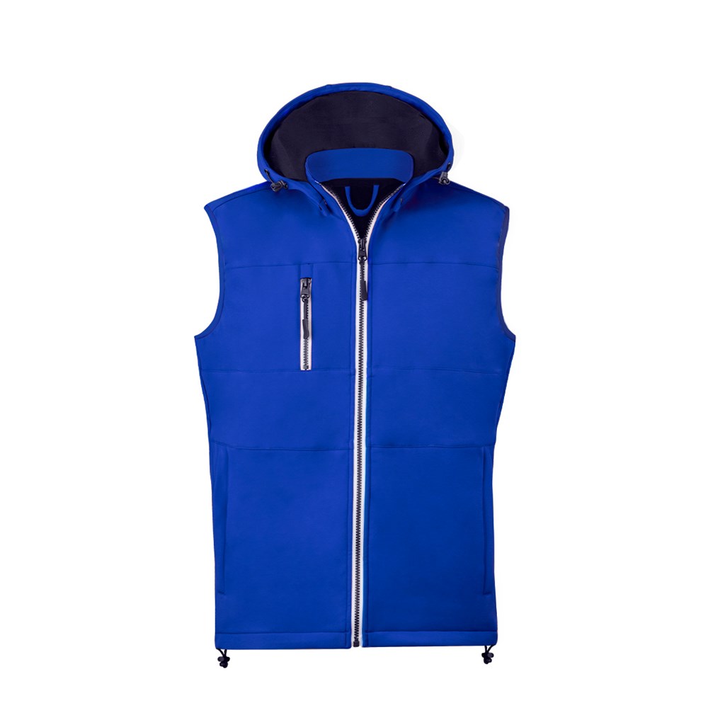 Vest made of durable and breathable 300g/m2 soft shell material. Modern fit with central zip, side pockets and practical chest pocket with zip fastenings and contrasting zip pullers. Stand-up collar with adjustable and detachable hood. Bottom hem with adjustable string. Wind and water resistant soft shell outside, and warm micro fleece lining in contrast colour. Available in sizes XS, S, M, L, XL, XXL.