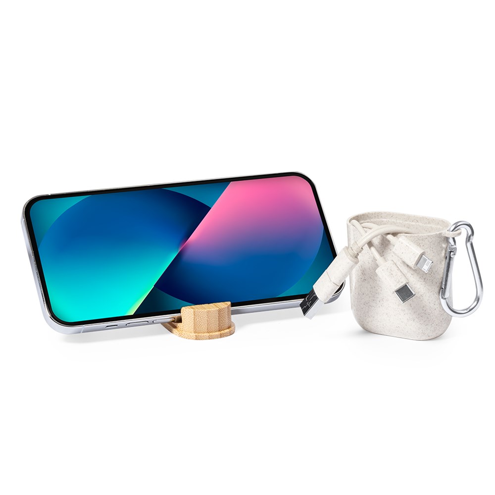 Charger cable made of wheat straw . With Type-C and USB input connections and Type-C, Lightning, and Micro USB outputs. 5V DC 2.4A. Presented in an elegant design case made of wheat straw and bamboo closing lid, with holder function for smartphones. Made with vegetal elements to promote the use of natural raw materials and reduce pollutant emissions.