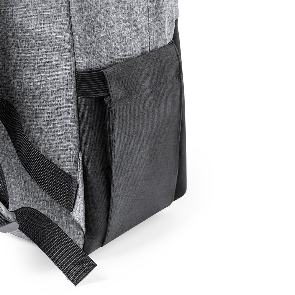 Backpack in resistant 600D RPET polyester, made from recycled plastic in order to promote the reuse of plastic waste and contribute to the sustainability of the planet. In an elegant two-colour finish, it includes an external label with the RPET logo. Main pocket with padded compartments for laptops up to 15 inches and tablets up to 10 inches. Padded back and shoulder straps.
