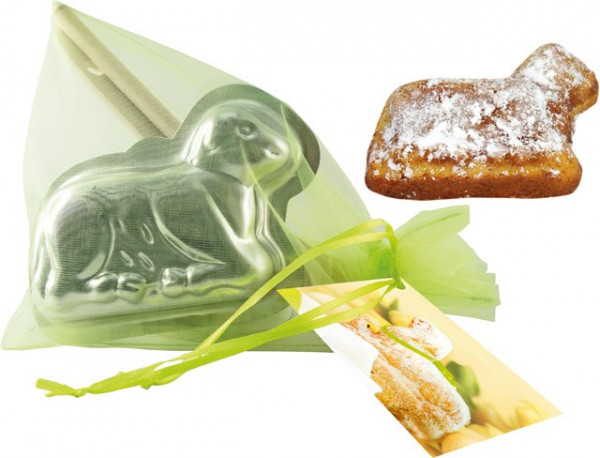 The organza bag contains a baking mould lamb, a wooden stirring spoon and a pastry brush. You will find an Easter baking recipe on the attached card. The standard design of the card offers enough space for your advertising. Your personalisation of the card starts with 100 pieces. Content: baking mould lamb (130 x 100 x 25 mm), wooden stirring spoon, pastry brush, greeting card with recipe (without biscuit)