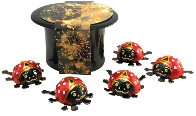 You will find 5 small chocolate beetles in the tophat that certainly will sweeten the end of the year and bring luck to the new year. Starting with 250 pieces you may use the paper band for your advertising or your individual design.