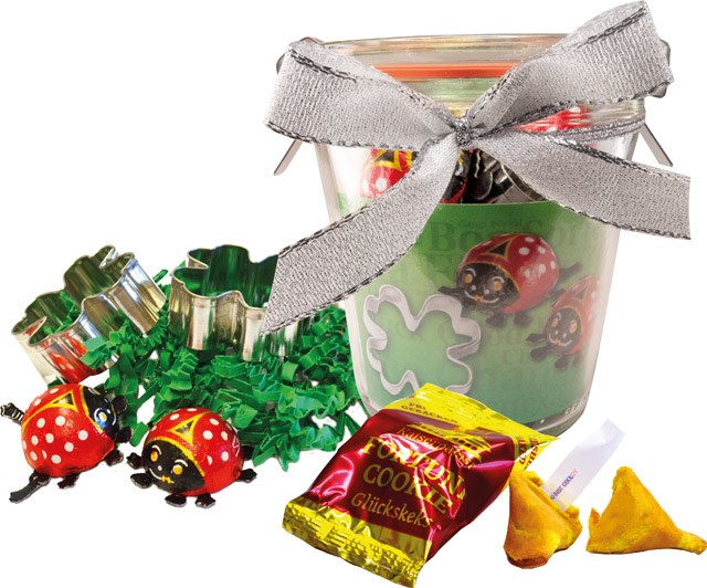 The Fortune Jar guarantees a congenial year-end closing and a successful start into the New Year. Inside the jar you will find 1 fortune cookie, 2 four-leaf-clover cookie cutters and 2 chocolate ladybirds. Advertising on the standard design or your personalisation of the inlay card starts with 100 pieces.