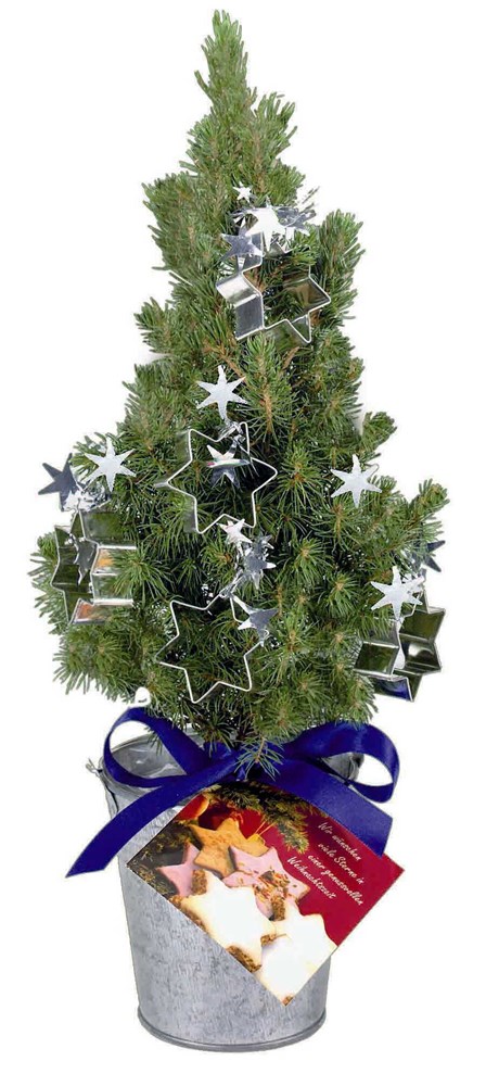 Content: young spruce 20–30 cm decorated with 5 cookie cutters star each approx. 5 cm, zinc bucket, recipe card