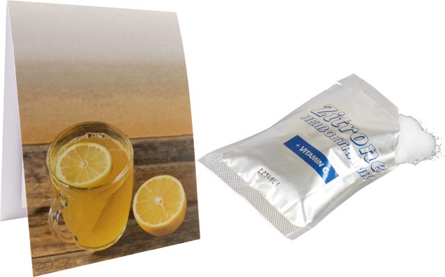 After a walk in the snow or to prevent a cold in winter time, the hot drink lemon is the right thing. It is quickly and easily prepared with hot water. The card offers enough space for your advertising or personalisation starting with 250 pieces.