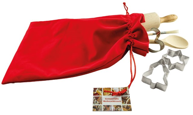 That will make cooking and baking a real pleasure. In our nice red velvet bag you get a rolling pin, a pastry brush, a stirring spoon and 3 cookie cutters (heart, fir tree, star) with attached greeting card. Your personalisation of the card starts with 100 pieces.