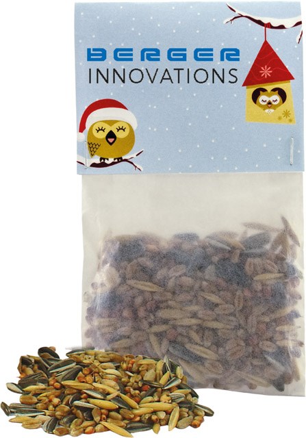 A likeable giveaway not only for bird lovers. The glassine bag contains 20 g of bird food. You may use the header for your advertising. Your personalisation starts as well with 250 pieces. Content: bird food (approx. 20 g)