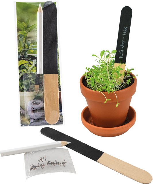 Gladden your customers with a little herb oasis. The item consists in a mixture of herb seeds, a rewriteable wooden stick to mark the seed place and a suitable pencil. Your advertising can show up on the standard design card. Your personalisation starts as well with 250 pieces. Content: wooden stick, white pencil, seeds: mixture of herbs