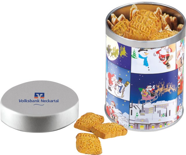 In a colourfol Christmas Tin you have approx. 90 g spiced biscuits. Your personsalisation of the band starts with 100 pieces. Pad printing on the lid starts with 100 pieces. Content: Metal tin with approx. 90 g spiced biscuits