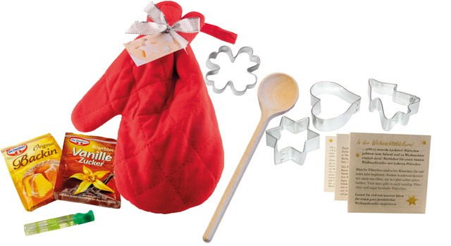 Content: recipe leporello in german, stirring spoon, vanilla sugar, baking powder, lemon flavouring, 4 cookie cutters, each approx. 5 cm (star, fir tree, four-leaf-clover, heart)