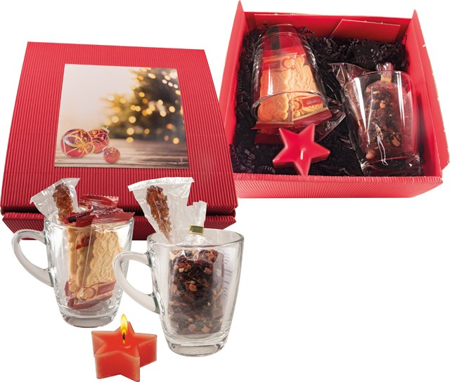 Grant to your customers a special Christmas tea break for two. Our set Tea For Two comes with two glass mugs, two sugar candy sticks, tasteful Christmas fruit tea, yummy spiced biscuits and a cute star candle. You may use the label for your advertising or your personalisation. Both start with 100 pieces.