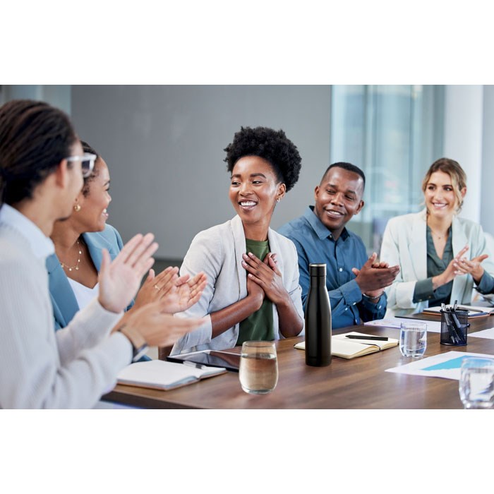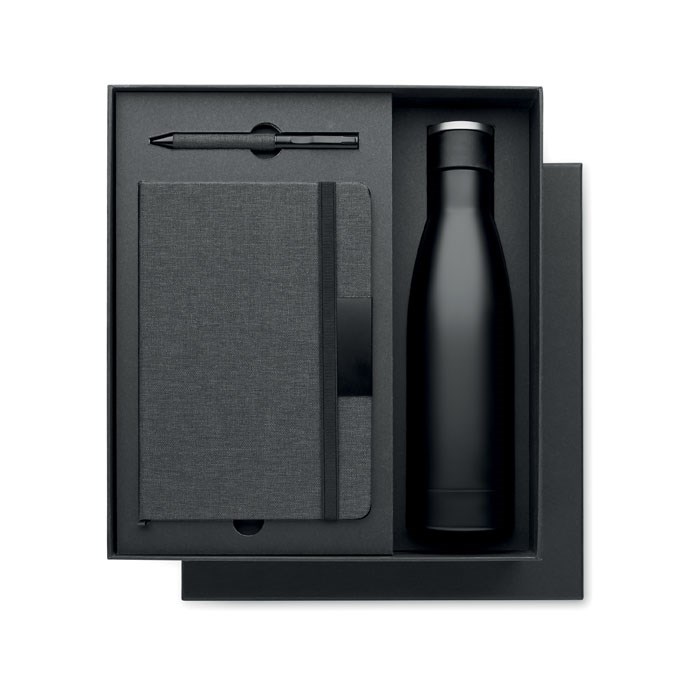 Luxury 3 piece gift set. It includes an A5 notebook with hard RPET cover. Casebound. 160 lined recycled paper pages (80 sheets). Matching elastic closure strap and ribbon page-marker and pen holder. Matching twist ball pen. Double wall stainless steel vacuum insulated bottle. Capacity: 500 ml. Presented in a luxury gift box. FSC®-certified | FSC MIX CREDIT, P7.1, FSC-C213206