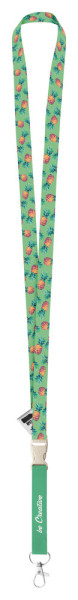 Custom made, 15 mm wide RPET lanyard with detachable metal carabiner and wheat straw plastic buckle. With sublimation printed graphics on both sides. MOQ: 100 pcs.