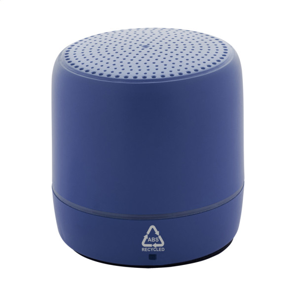 Recycled ABS wireless speaker with hands-free call function and built-in rechargeable battery. Including USB charger cable.