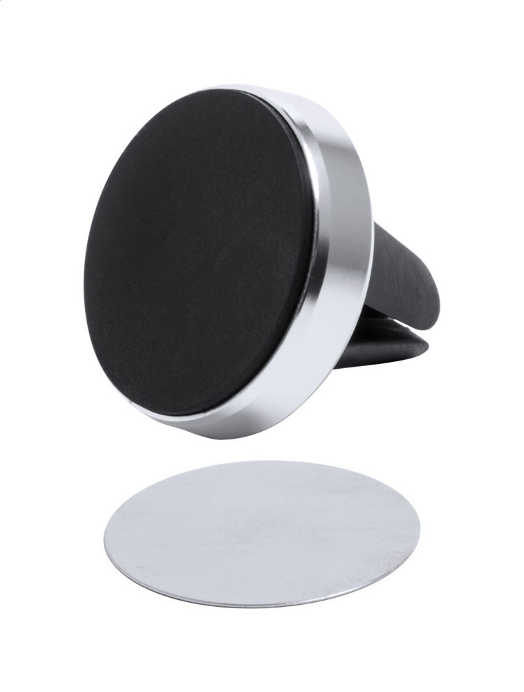 Aluminium, magnetic car mobile holder with air vent mounting. Including self-adhesive metal plate. In gift box.