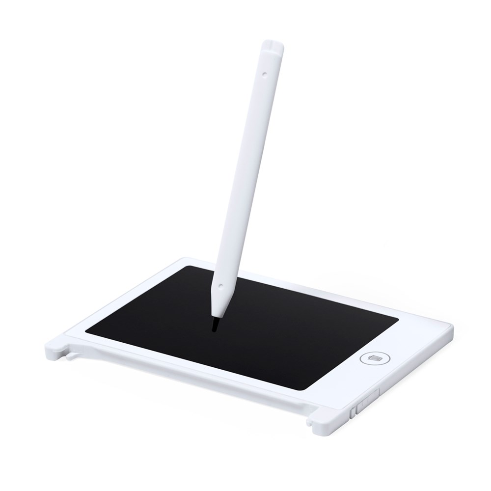 LCD writing tablet made of resistant material, with magnetic fixing and pen holder. 4.5 inches LCD screen, including stylus, erase button and erase lock. Button battery included and presented in kraft design box.