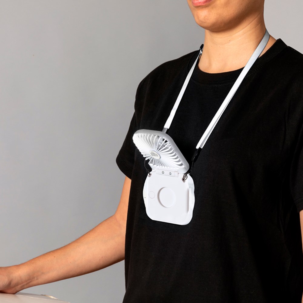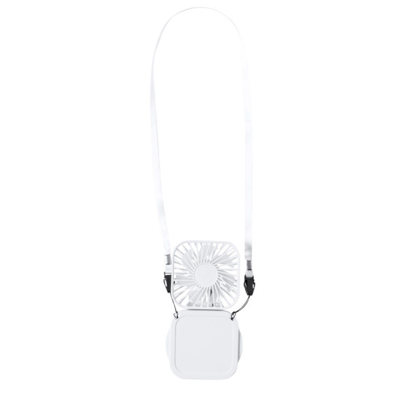 Portable fan made of durable ABS. With three speeds and integrated smartphone holder. Powered by a 300 mAh battery, with charge level indicator lights and Micro USB cable included. Presented individually in a kraft design box.