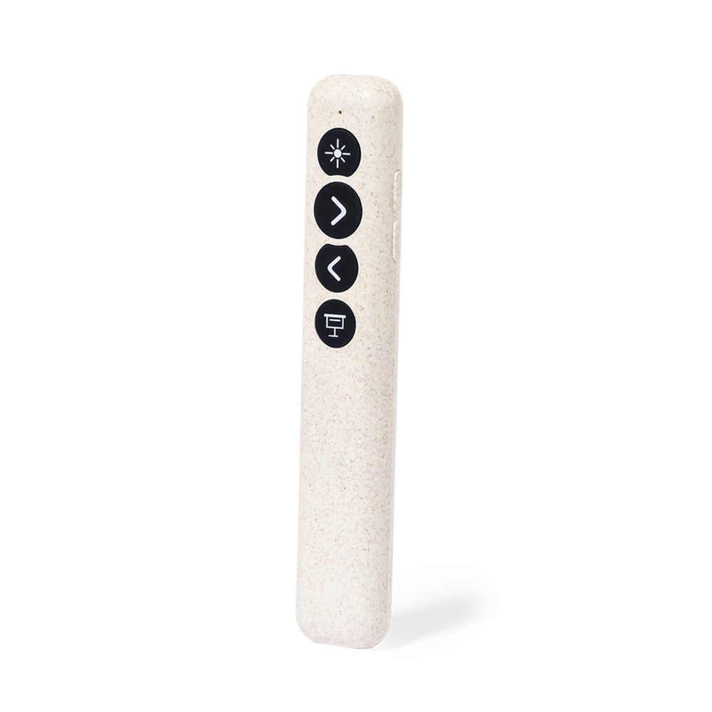 Stylish class 2 laser pointer with USB connection made of wheat straw. Specially designed for PowerPoint and Keynote presentations, with side activation button, forward, pause and rewind buttons. Body specially designed for pad printing branding. Battery powered: 1xAAA included. Presented in a kraft design box, with instruction manual in English and Spanish.Wheat straw promotes the use of natural raw materials, thus reducing pollutant emissions.