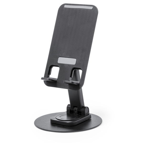 Foldable holder for smartphone and tablet, made of durable aluminium and ABS. Height adjustable, with non-slip rubber pads on base and holder. In sober white or black finish, and with large branding surface. Presented in an attractive design box.