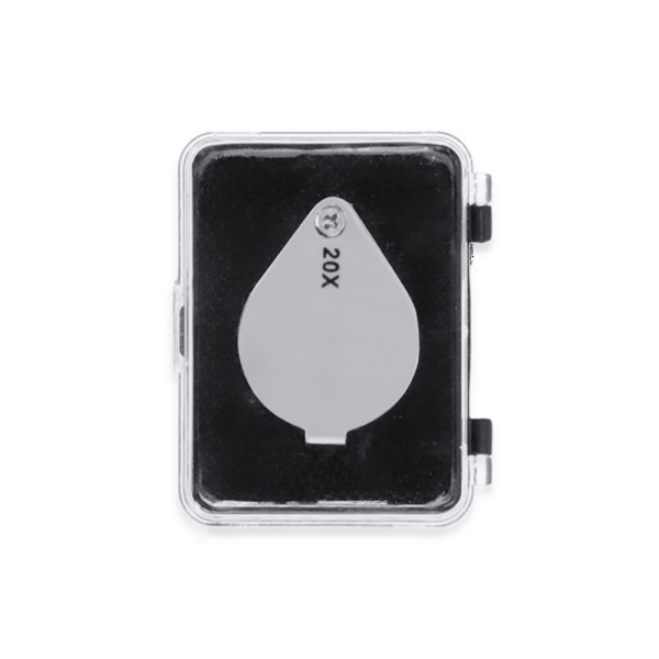 20x folding magnifier made of durable metal. Great magnification for a very close view of the smallest details with no distortion. Ideal for inspecting tiny objects, text, etc. It also has an accessory for hanging and comes inside a case with padded interior for extra protection. Presented in a black cardboard box.