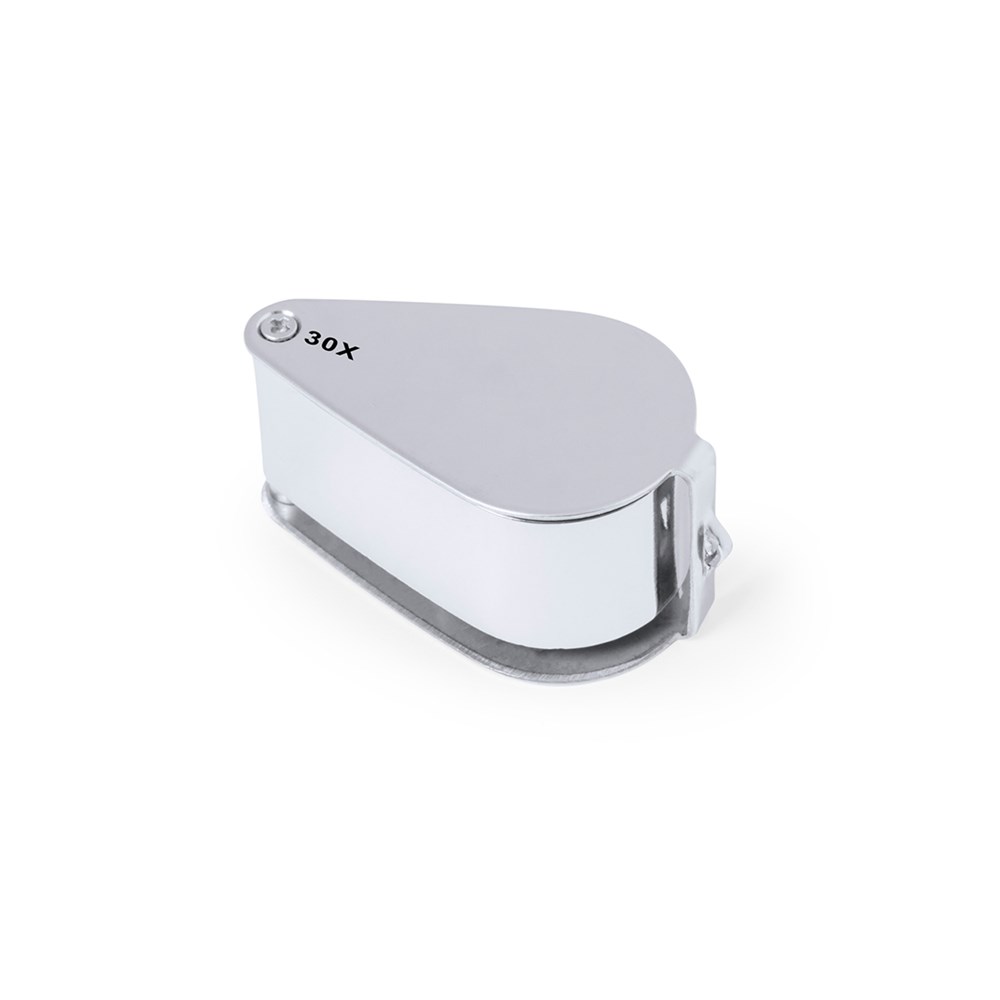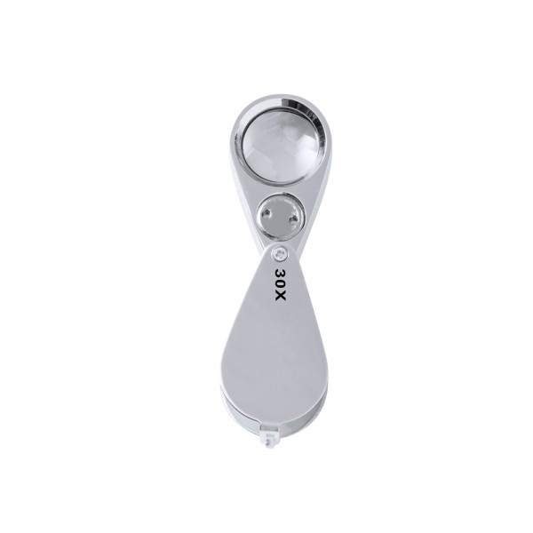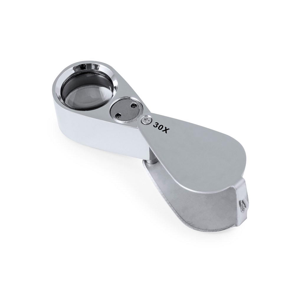 30x folding magnifier made of resistant metal. With integrated LED lights and great magnification for a very close view of the smallest details with no distortion. Ideal for inspecting small objects, text, etc. It also has an accessory for hanging and comes inside a case with padded interior for extra protection. Battery powered (button batteries included), with special key to replace them when empty. Presented in a black cardboard box.