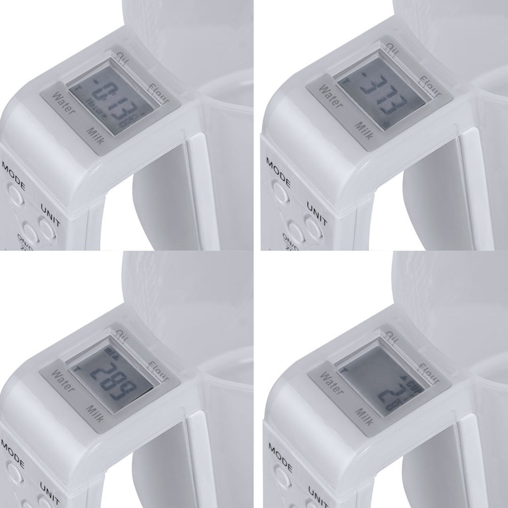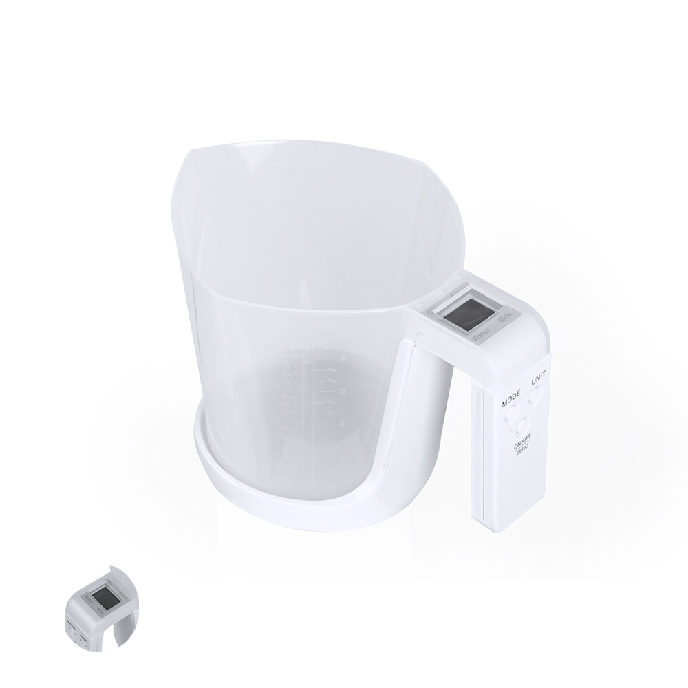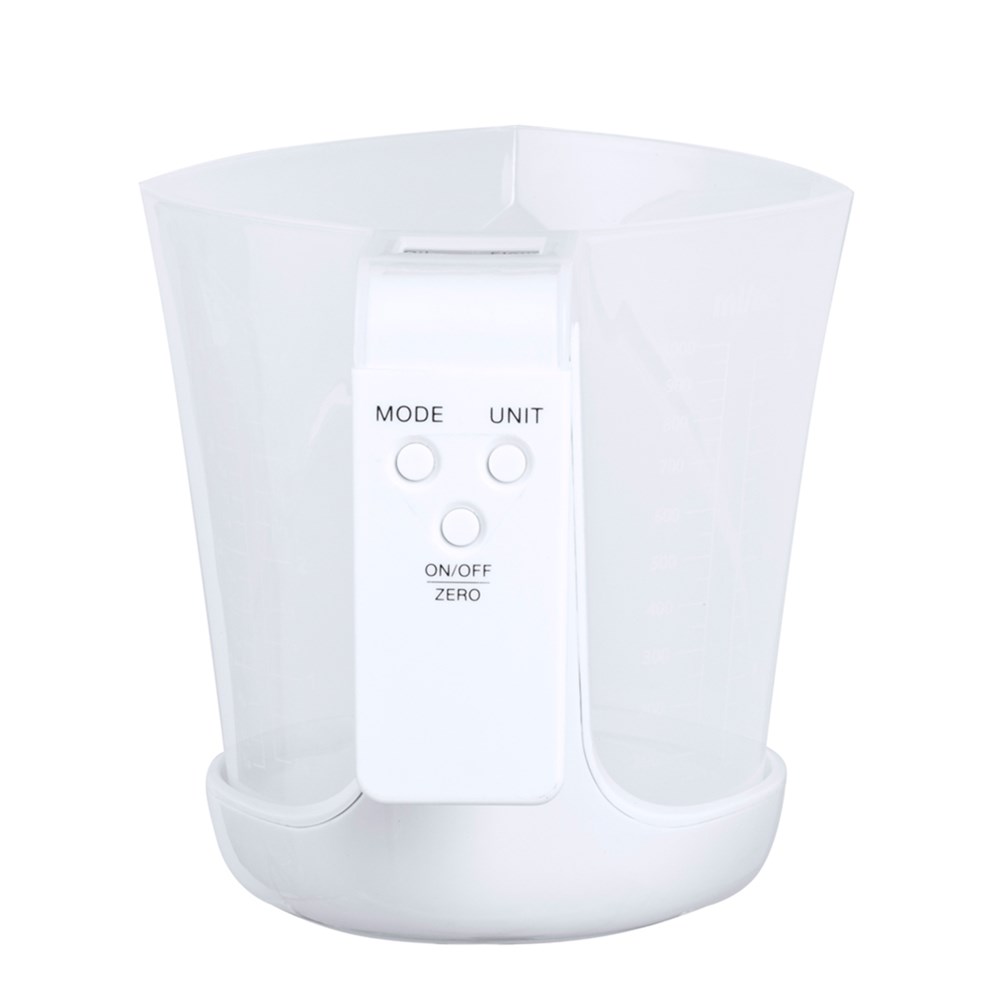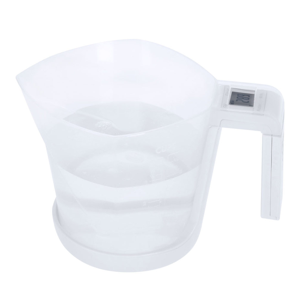 Báscula con jarra medidora integrada, fabricada en resistente combinación de PP y ABS. Pantalla LCD con control por botones y función de tara, con capacidad máxima para 5 kg de peso y válida para medir elementos líquidos o sólidos.Incluye Jarra medidora de 1L de capacidad, con multitud de opciones y vertedero en el borde para evitar derrames::-1L, con medidor lateral en tramos de 50 ml; -32 oz,, con medidor lateral en tramos de 2 oz -Medición rápida en volumen de tazas,Funciona con pila de botón (incluida) y viene presentada individualmente en caja.