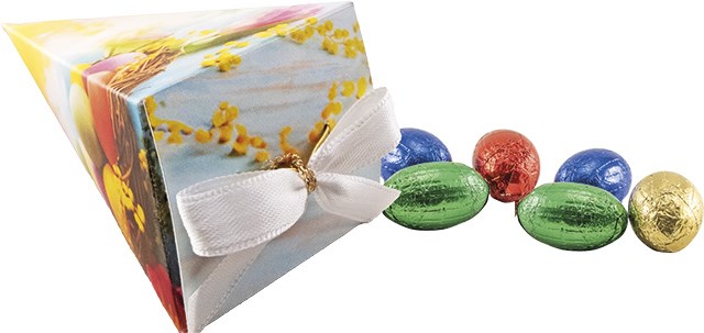 A little cone for chocolate fans. Filled with yummy chocolate eggs it is suitable for your promotion during the Easter. We wish you a sweet Easter. Your advertising can show up on the standard design. A personalisation of the cone starts with 250 pieces, too. Content: 6 chocolate eggs (each 6,5 g)