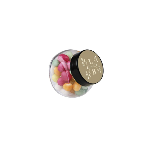 Micro glass jar 50 ml with white lid, including full colour printed sticker on the lid and filled with Licorice sticks mix