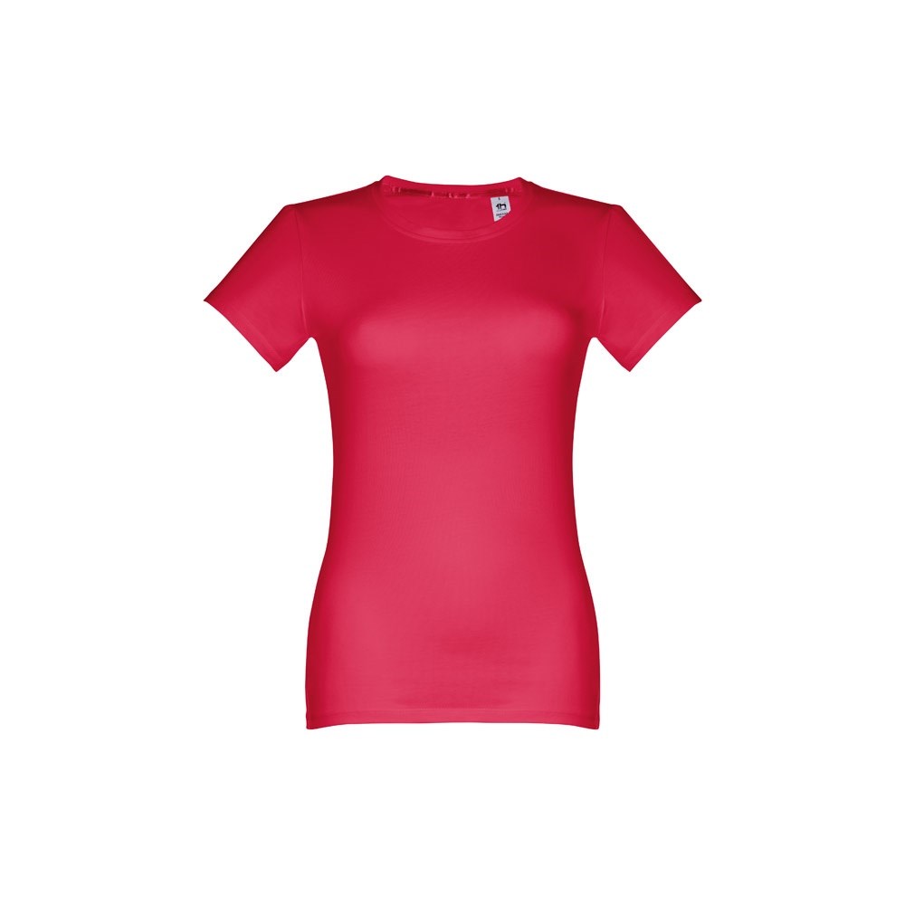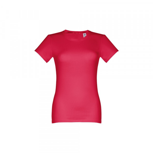 100% cotton jersey Women's fitted T-shirt (190 g/m²) with carded cotton yarn (colour 183: 90% cotton and 10% viscose). Features a thin jersey collar with satin ribbon reinforcement. Piece cut and sewn with double seam sleeve cuff and hemline. Sizes: S, M, L, XL, XXL