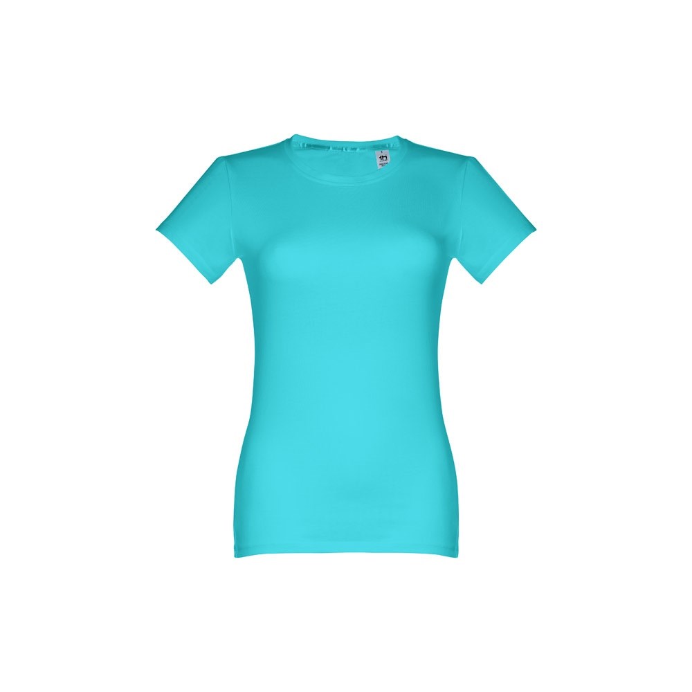 100% cotton jersey Women's fitted T-shirt (190 g/m²) with carded cotton yarn (colour 183: 90% cotton and 10% viscose). Features a thin jersey collar with satin ribbon reinforcement. Piece cut and sewn with double seam sleeve cuff and hemline. Sizes: S, M, L, XL, XXL