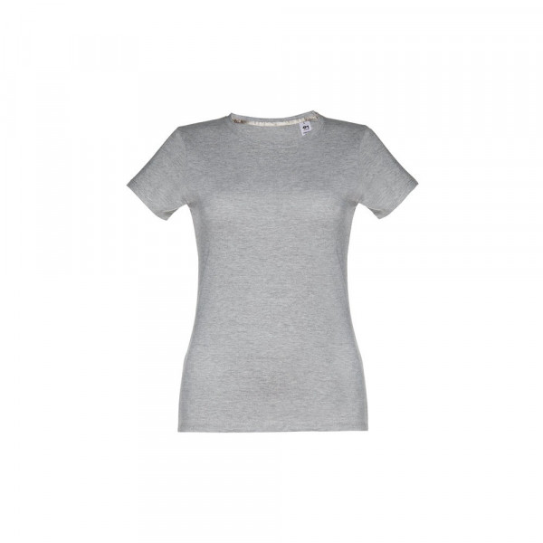 100% cotton jersey Women's fitted T-shirt (190 g/m²) with carded cotton yarn (colour 183: 90% cotton and 10% viscose). Features a thin jersey collar with satin ribbon reinforcement. Piece cut and sewn with double seam sleeve cuff and hemline. Sizes: S, M, L, XL, XXL