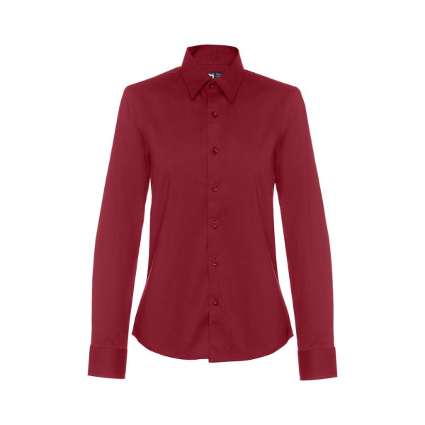 Long-sleeved shirt for women in 68% cotton, 28% polyamide and 4% elastane (115 g/m²). Long sleeve with 1 pleat and adjustable cuffs with 1 button. Fitted waist with 2 darts on the back and placket with 7 matching colour buttons. Sizes: S, M, L, XL, XXL