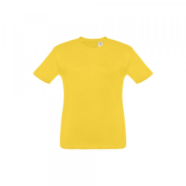 Kids' T-shirt (unisex) in 100% carded cotton jersey (150 g/m²). Contains a 1x1 Rib collar with jersey reinforcement bias tape. Cut and sewn garment, double stitched on the sleeves and hemline Sizes: 2, 4, 6, 8, 10, 12