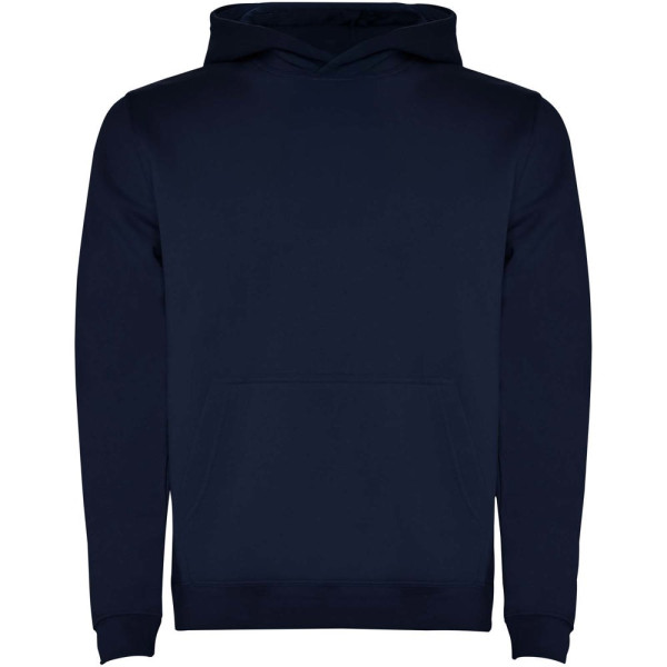Two-colour hoodie with double fabric. Reinforced covered seams in collar and kangaroo style pocket. 1x1 elastane rib in cuffs and waistband. Removable label. The model is 120 cm and is wearing size 5/6.