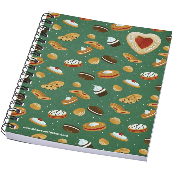 Add some bold colour to your notes with this A6 spiral notebook. It includes 50 sheets of blank 80 g/m2 recycled paper and a 320 g/m2 card front cover in a choice of colours. You can customise the pages of this versatile notebook with any design - so whether you want lined paper, squares or dots - anything is possible! Manufactured using responsibly sourced materials. Made in the UK.