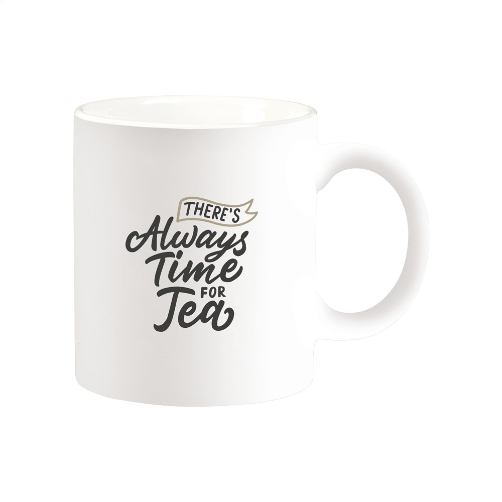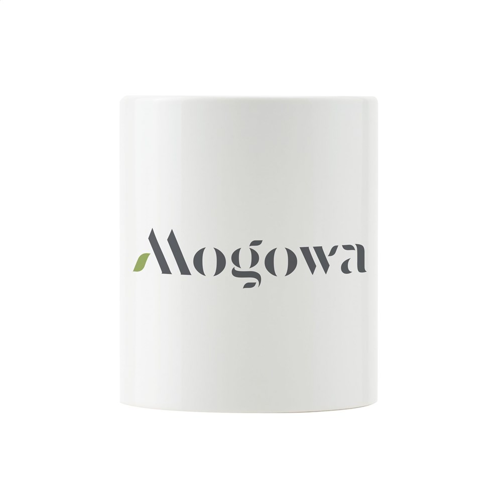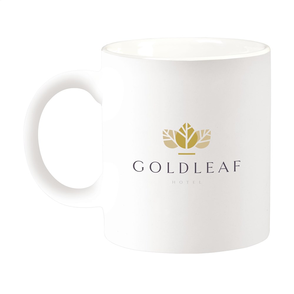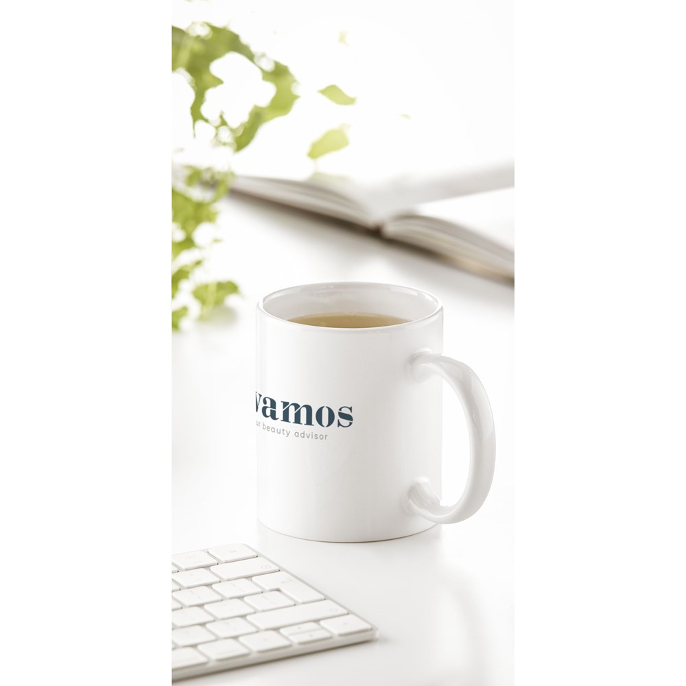 High quality ceramic mug. In all white or with a coloured exterior. Dishwasher safe. The imprint is dishwasher tested and certified: EN 12875-2. Capacity 350 ml.
